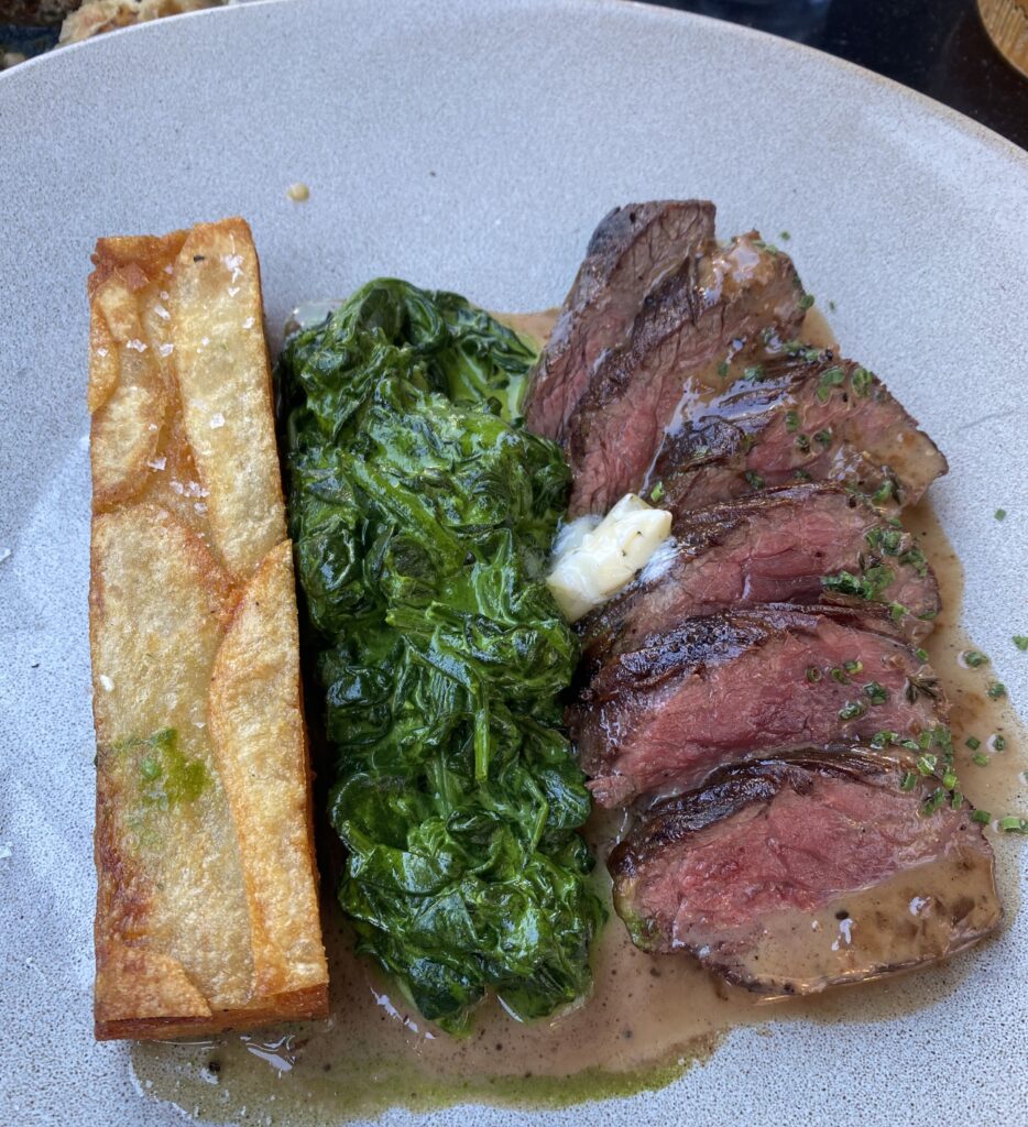 Leroy’s Hangar Steak in an au poivre sauce, served with a crispy potato terrine, and creamed spinach. Photo: Linda Sheridan