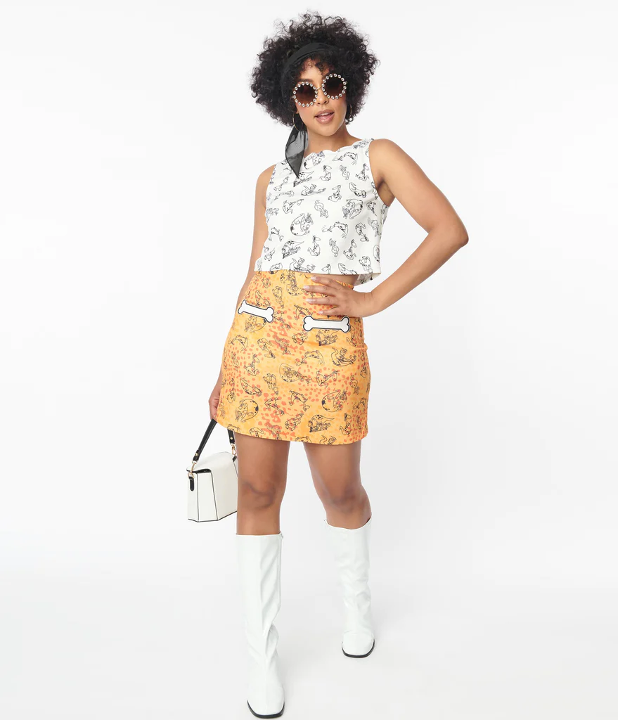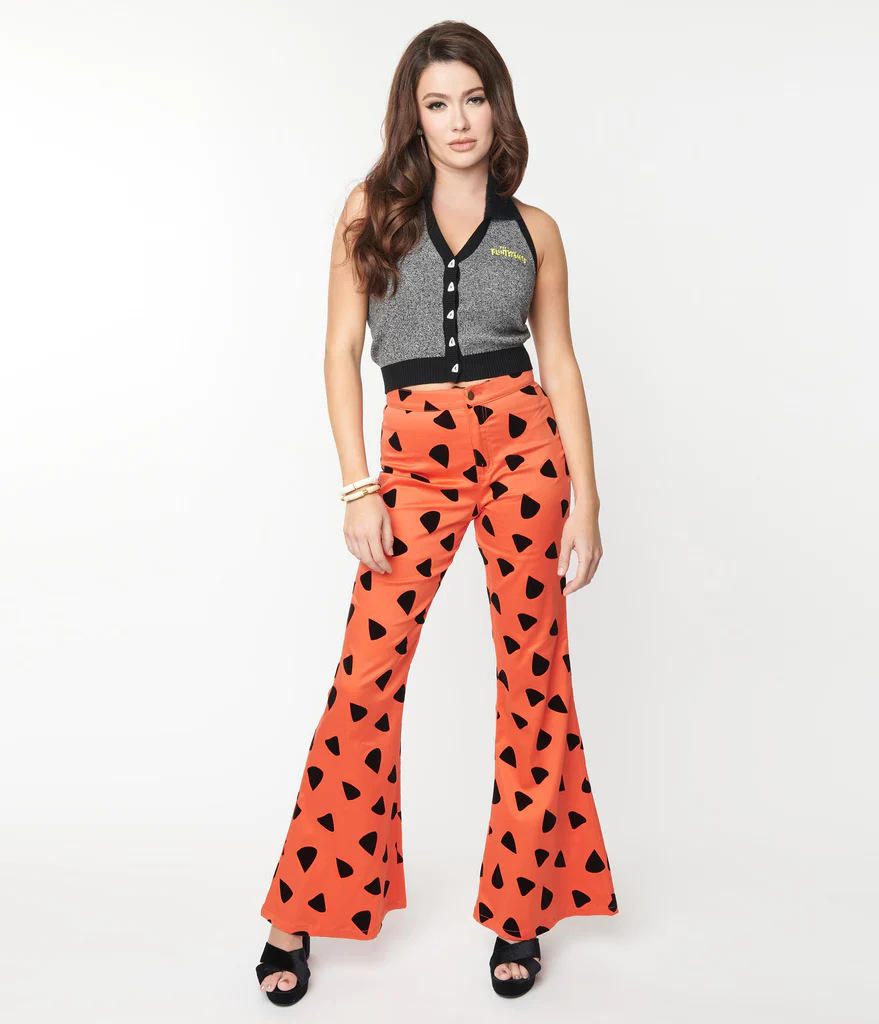 The Los Angeles brand shares that this classic show was selected because of its “iconic and prehistoric” looks. “Wilma’s single-strapped, white dress with pearls, Betty’s single-strapped royal blue dress, and Fred’s orange animal print tunic with turquoise tie” are all examples of the inspired clothing line that any size, shape, or color, can now rock (or should I say bedrock?).