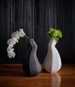 The cradle-to-cradle collection embodies mindful luxury, employing closed-loop, zero-waste processes and production methods that mitigate environmental harm while showcasing serious attention to style. The vessels, “named after flowers and birds,” says Carr, vary in shapes, size, texture, composed of surprisingly lightweight, durable biomaterials.