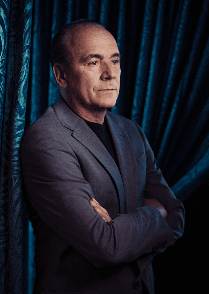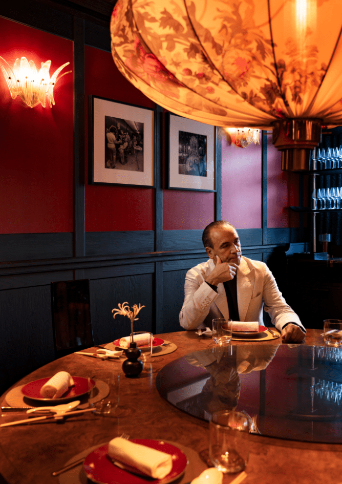 JEAN-GEORGES at the entrance to House of the Red Pearl. Giorgio Armani suit and sweater, armani.com