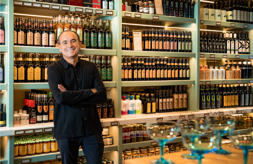 JEAN-GEORGES in front of the oils and vinegars inspired by his mother at Merchantile West. Shirt and pants, his own.