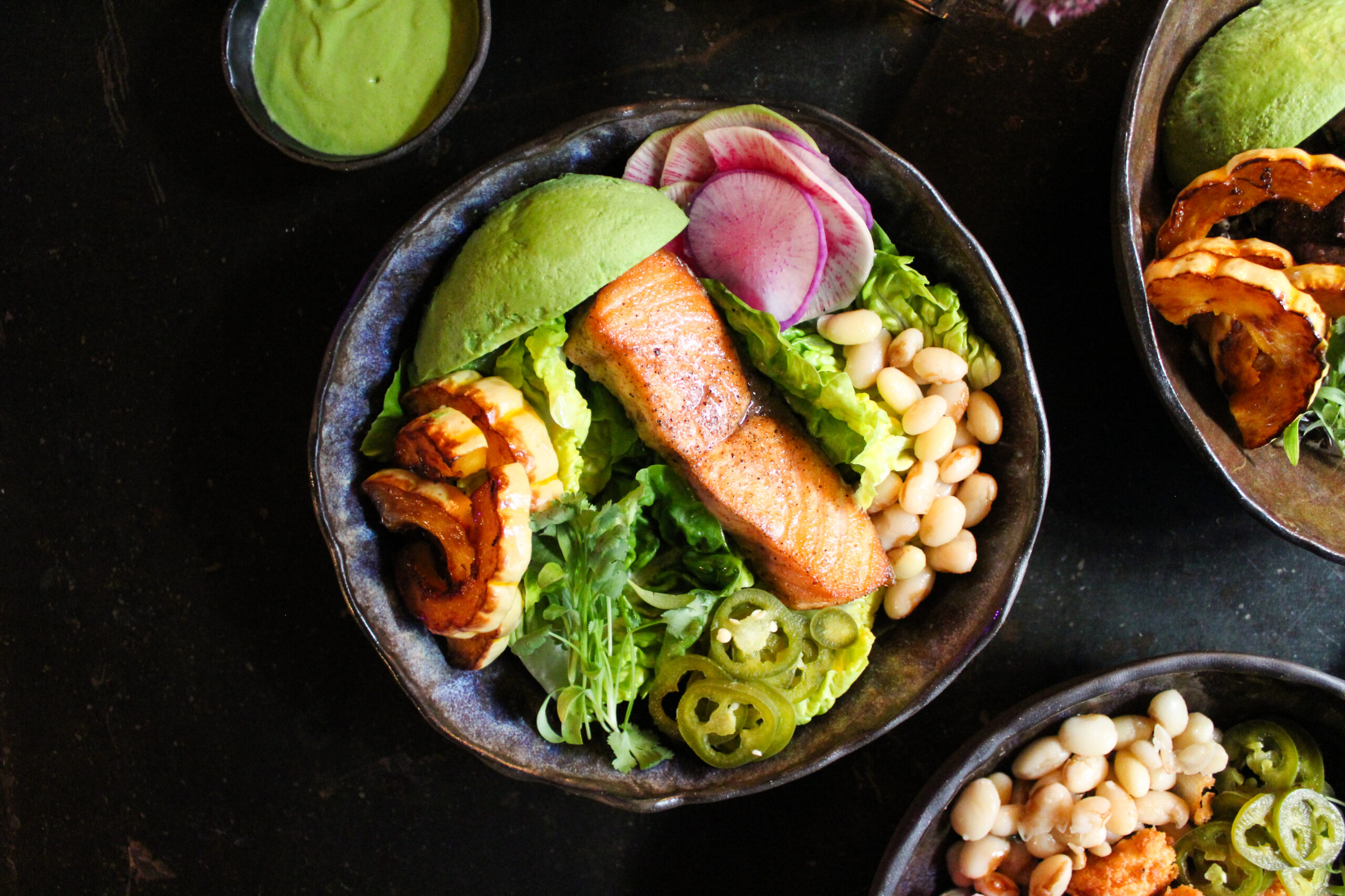 Market lettuce bowl with faroe island salmon, avocado, roasted delicata squash, pickled jalapeños, and marinated beans. Photo via ABC Cocina.