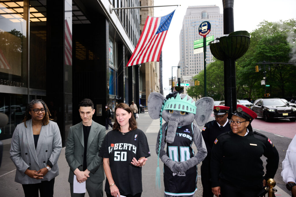 Left to right: Keia Clarke, CEO of the Liberty. Jonathan Kolb, General Manager of the Liberty, Jessica Lappin, President of the Downtown Alliance, Ellie the Elephant.