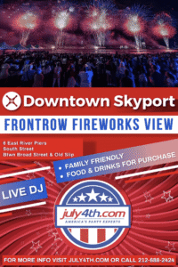 If you’re eager to see some fireworks light up the sky this Independence day, check out Downtown Skyport’s Front Row Fireworks Party, located at 6 East River Piers. This is a family-friendly event featuring live DJ performances, food and drinks to purchase, and various fun activities. Doors open at 7 PM, so guests can enjoy unobstructed views of the East River’s fireworks show. Tickets are $60, and can be purchased via july4th.com.