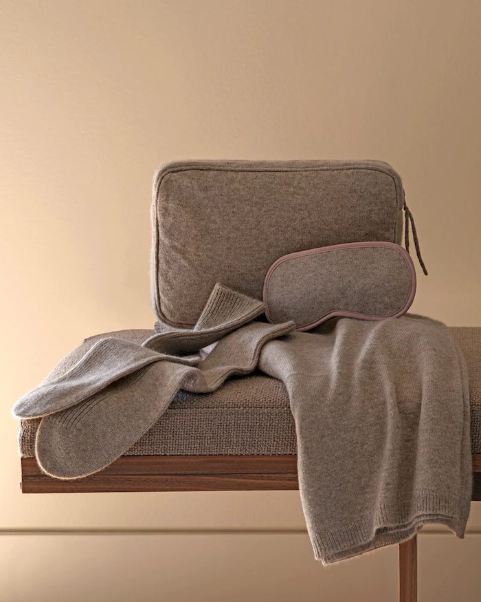 AVIANO TRAVEL SET: A masterclass in refinement and rest, Sofia Cashmere’s gorgeous cashmere travel set includes a richly soft blanket, matching eye mask, knit socks, and zipped case that doubles as a travel pillow, all crafted with meticulous attention to detail. Lightweight, elegant,and effortlessly portable, it is the ultimate indulgence for those who expect first-class comfort wherever they go.sofiacashmere.com