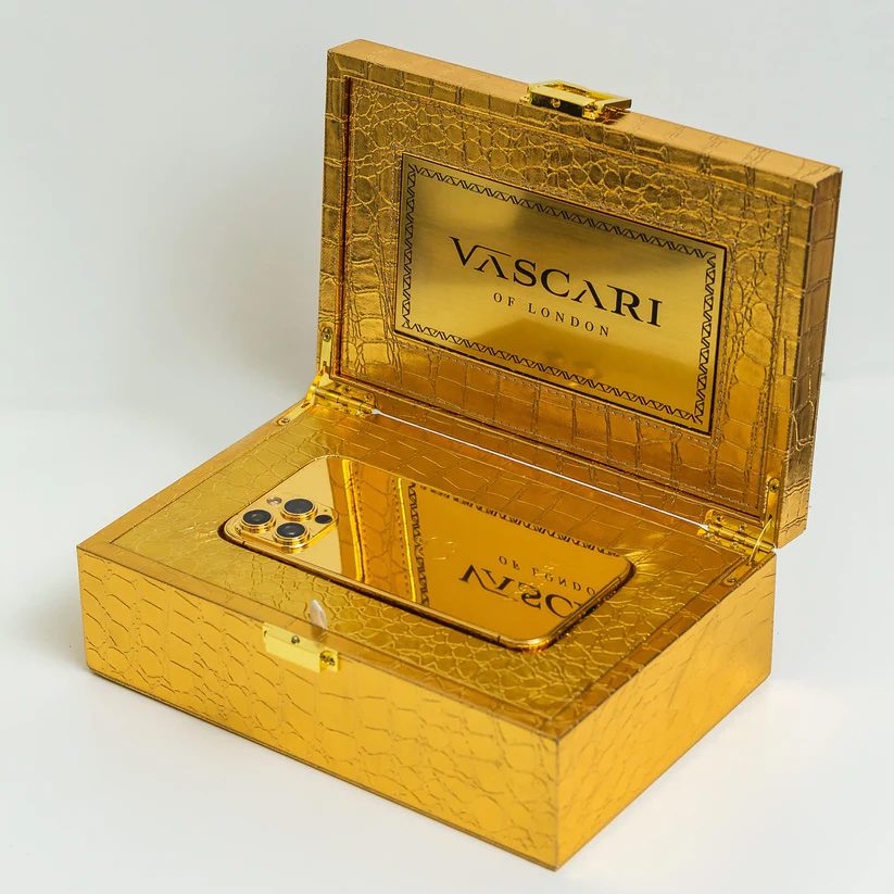 24K GOLD IPHONE: Where elite craftsmanship meets cutting-edge technology, this handcrafted iPhone is luxuriously plated in 24-karat gold and finished in your choice of smooth, crocodile-embossed, or diamond-encrusted detailing. Designed in London and presented in a bespoke gift box, it transforms a modern essential into the ultimate symbol of power, prestige, and personal style. vascari.com