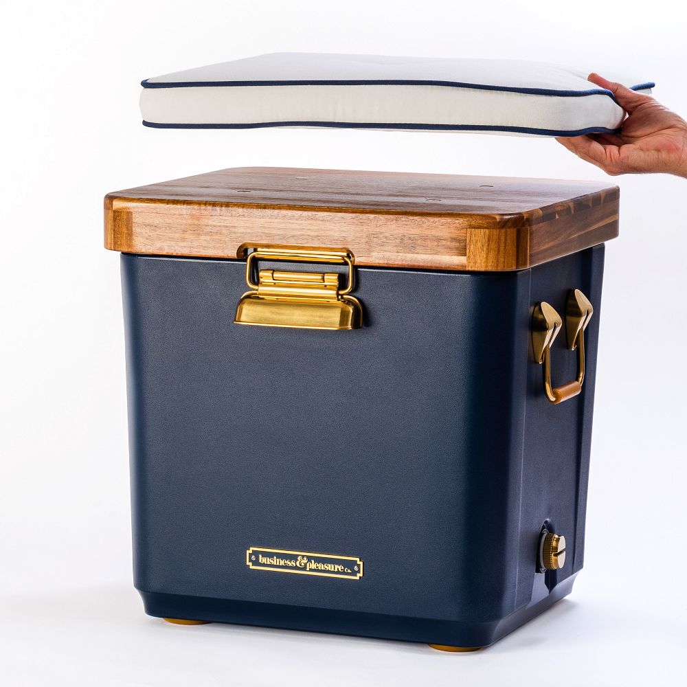 BUSINESS & PLEASURE HEMINGWAY COOLER BENCH: Bring sophistication to any gathering with this chic, multifunctional bench that conceals a fully insulated cooler beneath its elegant design. Perfect for both indoor soirées and outdoor celebrations, it blends practicality with polished style and is ideal for hosts who appreciate effortless entertaining and timeless craftsmanship. markandgraham.com