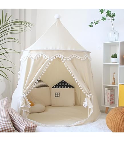 COZYKIDS PLAY TENT Let your child read or play in their magical hideaway in this soft, fabric tent created from a cotton/ hemp blend. Easy set up and storage. An upgraded version has a floor mat and a decorative rainbow wall hanging. Comes in blue, pink, or cream. 43 x 43 x 51 in. cozybabywear.com