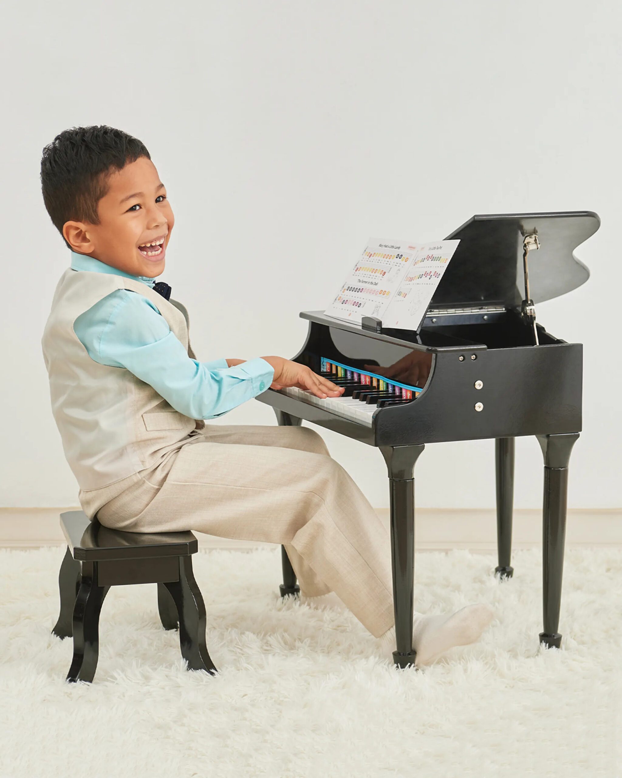 KID’S BLACK BABY GRAND PIANO: Spark a lifelong love of music with this elegant baby grand piano, complete with a matching bench and songbook. With 30 color-coded keys and a classic black finish, it’s a stylish and thoughtful gift for creative little ones ready to play in style. neimanmarcus.com
